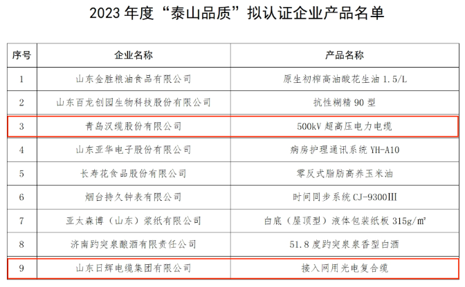 山東日輝電纜集團有限公司產品接入網用光電復合纜入選2023年度泰山品質擬認證企業產品名單。